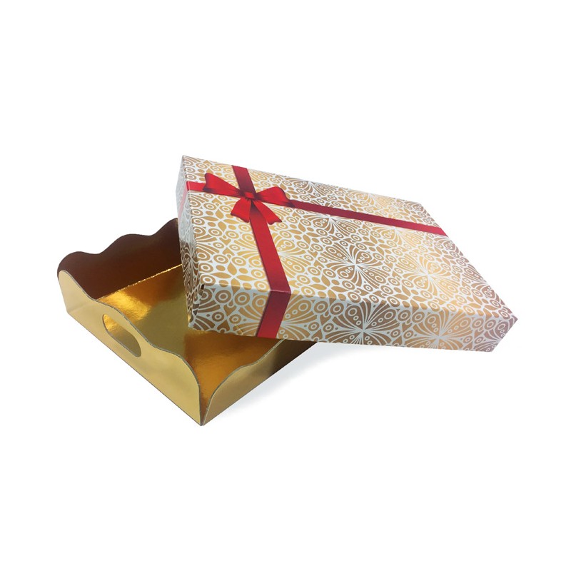 Batea metalizada oro con asas y tapa diseño estándar y elegante, fabricada en cartón holding virgen 100%, apto para el consumo alimentario.